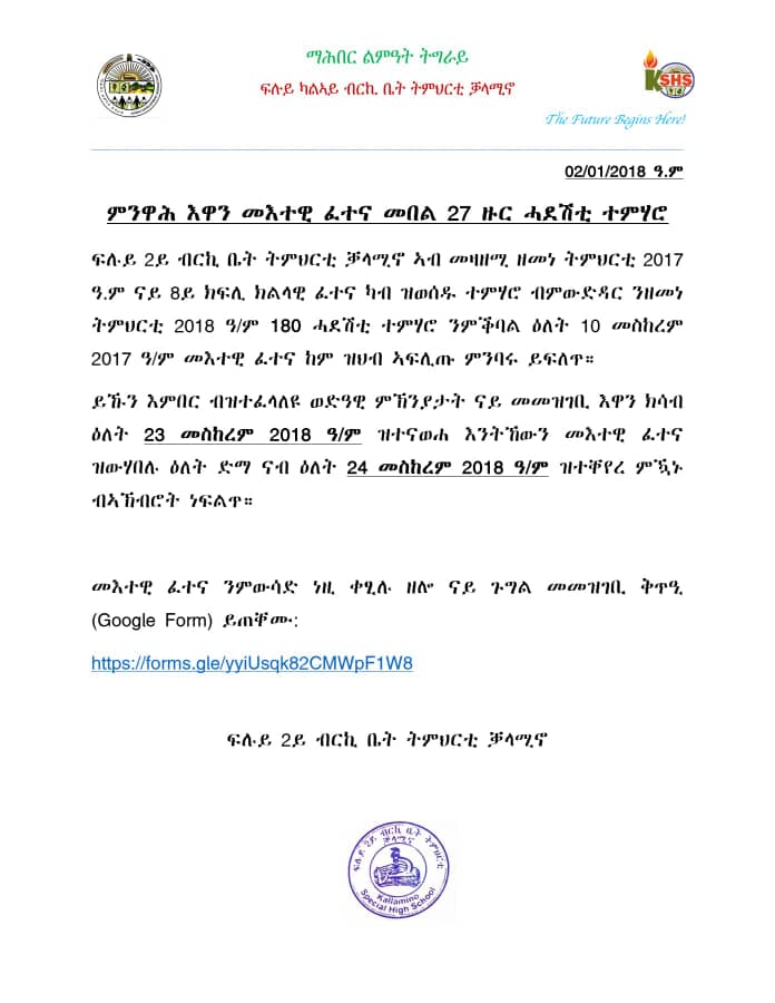 ፍሉይ 2ይ ብርኪ ቤት ትምህርቲ ቓላሚኖ ኣብ መዛዘሚ ዘመነ ትምህርቲ 2017 ዓ.ም ናይ 8ይ ክፍሊ ክልላዊ ፈተና ካብ ዝወሰዱ ተምሃሮ ብምውድዳር ንዘመነ ትምህርቲ 2018 ዓ/ም 180 ሓደሽቲ ተምሃሮ ንምቕባል ዕለት 10 መስከረም 2017 ዓ/ም መእተዊ ፈተና ከም ዝህብ ኣፍሊጡ ምንባሩ ይፍለጥ።ይኹን እምበር ብዝተፈላለዩ ወድዓዊ ምኽንያታት ናይ መመዝገቢ እዋን ክሳብ ዕለት 23 መስከረም 2018 ዓ/ም ዝተናወሐ እንትኸውን መእተዊ ፈተና ዝውሃበሉ ዕለት ድማ ናብ ዕለት 24 መስከረም 2018 ዓ/ም ዝተቐየረ ምዃኑ ብኣኽብሮት ነፍልጥ።መእተዊ ፈተና ንምውሳድ ነዚ ቀፂሉ ዘሎ ናይ ጉግል መመዝገቢ ቅጥዒ (Google Form) ይጠቐሙ:https://forms.gle/yyiUsqk82CMWpF1W8ፍሉይ 2ይ ብርኪ ቤት ትምህርቲ ቓላሚኖ